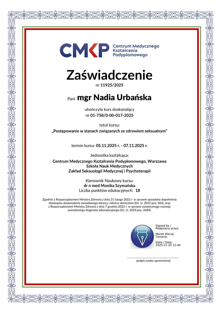 - Warszawski Uniwersytet Medyczny, studia podyplomowe z seksuologii klinicznej.