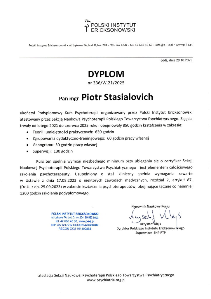 Piotr Stasialovich jest psychologiem, psychoterapeutą, seksuologiem, psychotraumatologiem i interwentem kryzysowym.